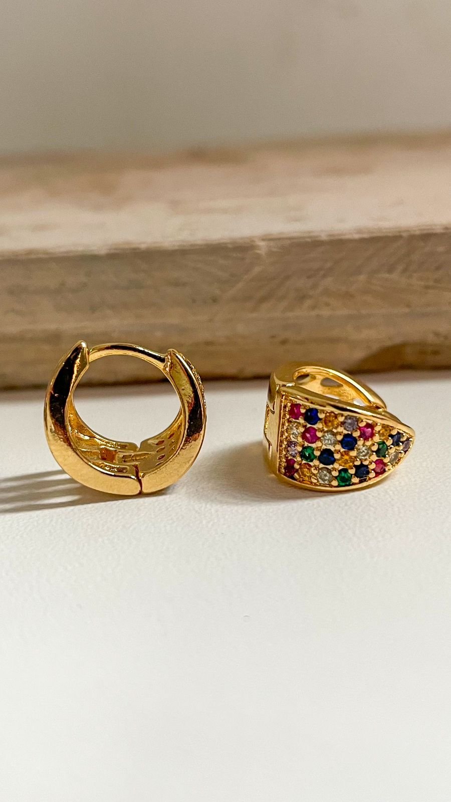Argola pequena com designer largo com dupla face sendo um lado com zircônias coloridas  cravejas e o outro com designer vazado.