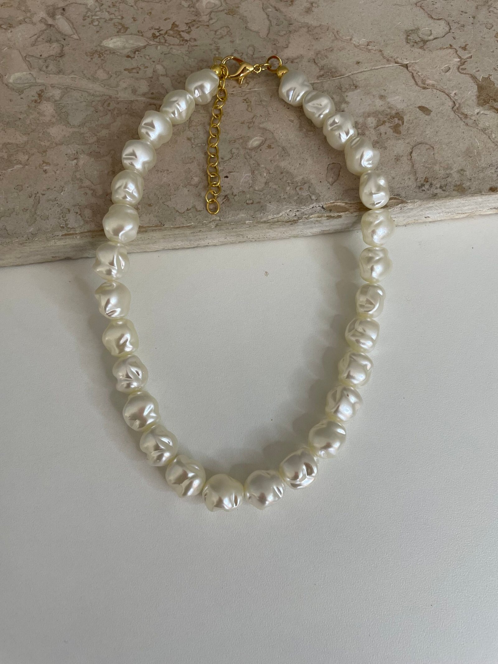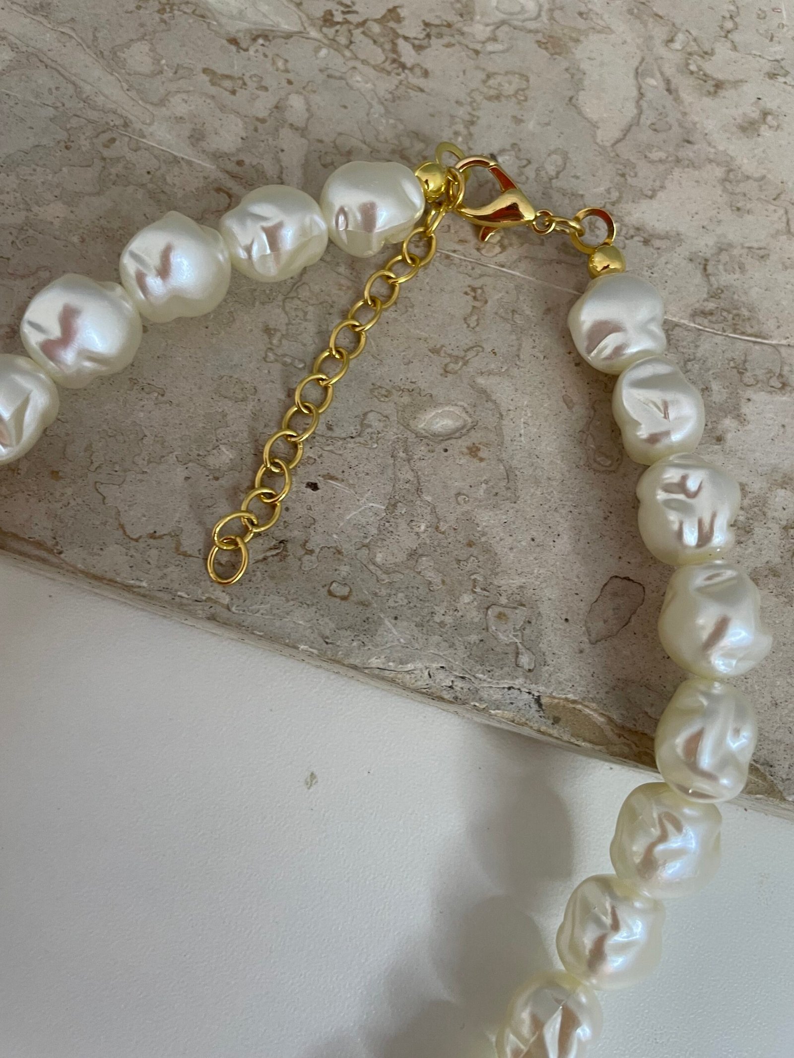 Colar composto por pérolas tipo barroca , com finalizações, fecho lagosta e extensor em semijoia , banhados a ouro 18k