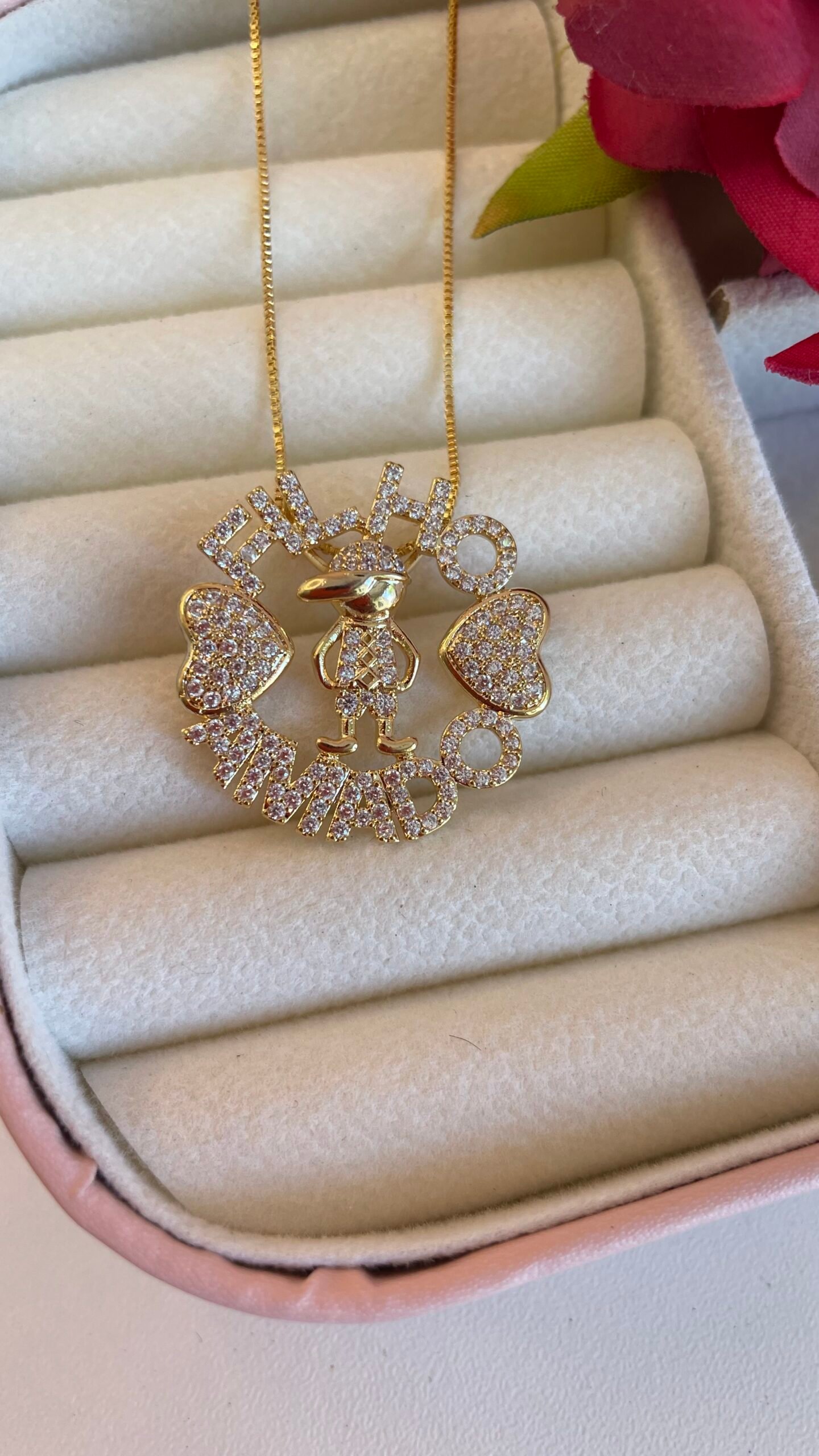 Colar folheado a ouro 18k , com corrente modelo veneziana, possue designer de mandala com frase FILHO AMADO, dois corações e uma menina, toda cravejada em zircônia.