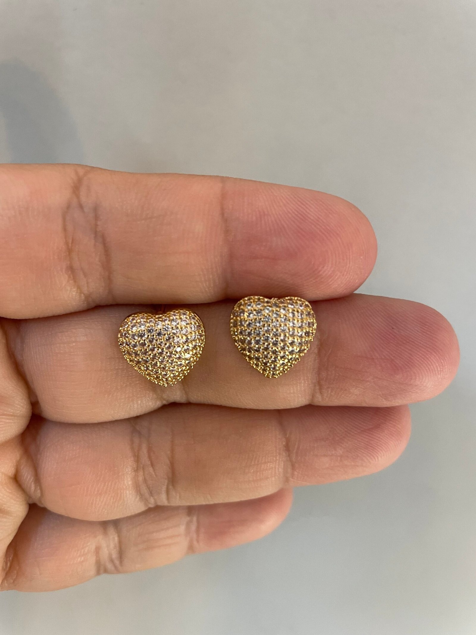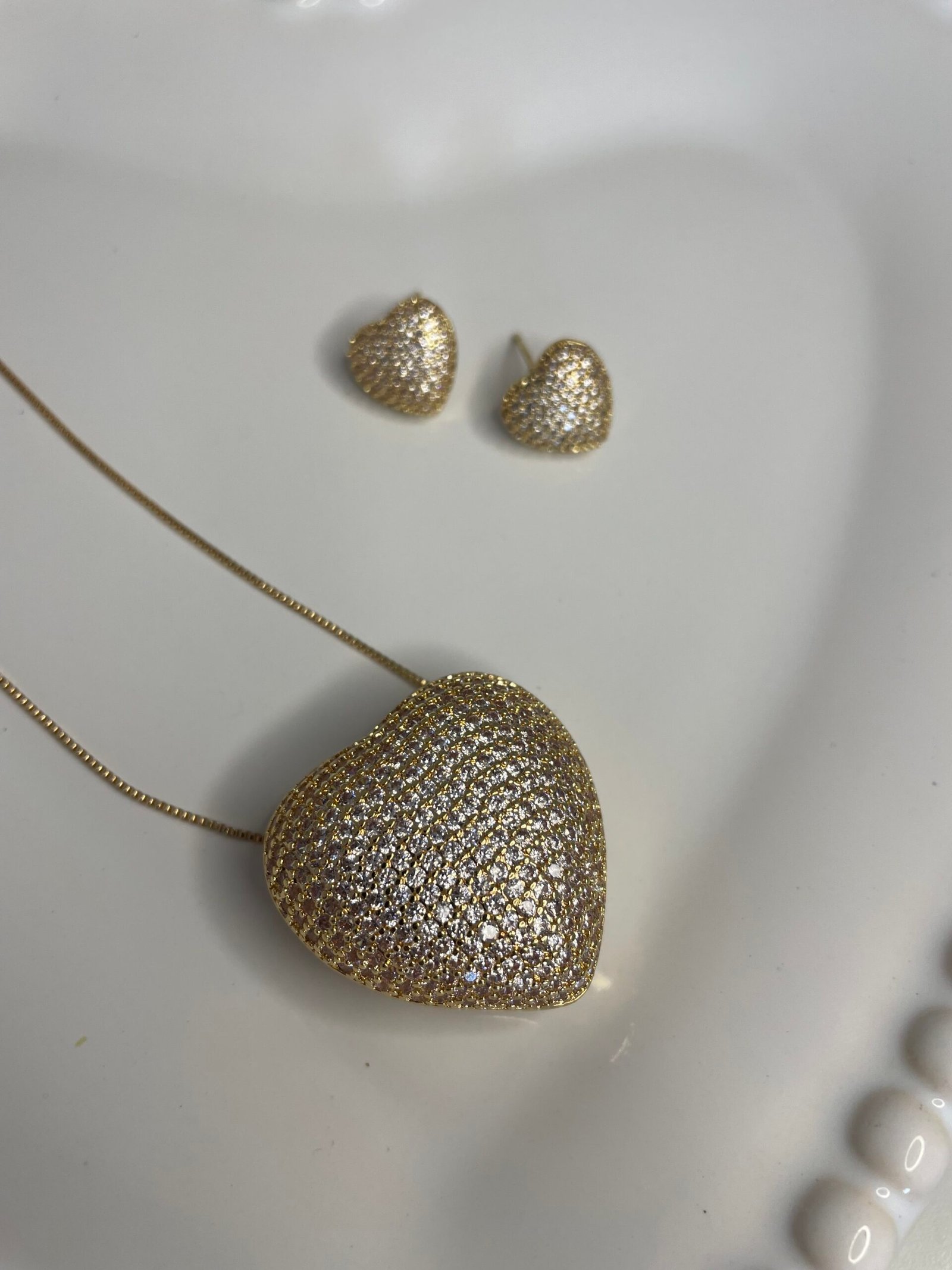 Conjunto composto por colar e brincos em formato de coração e cravejados com micro zirconias, sendo o pingente em formato 3d de um lado coração cravejado em micro zircônia e no outro mini corações vazados.