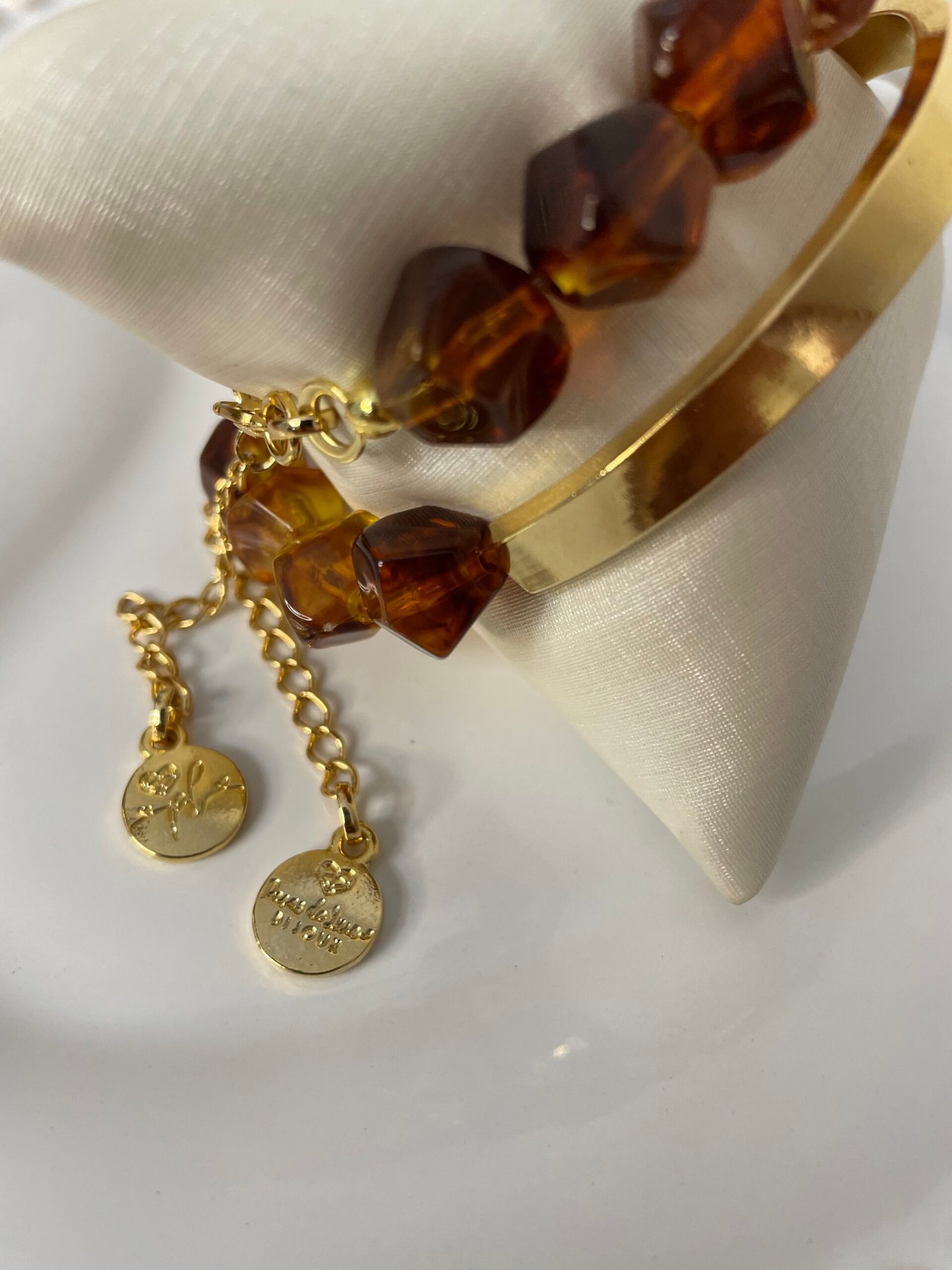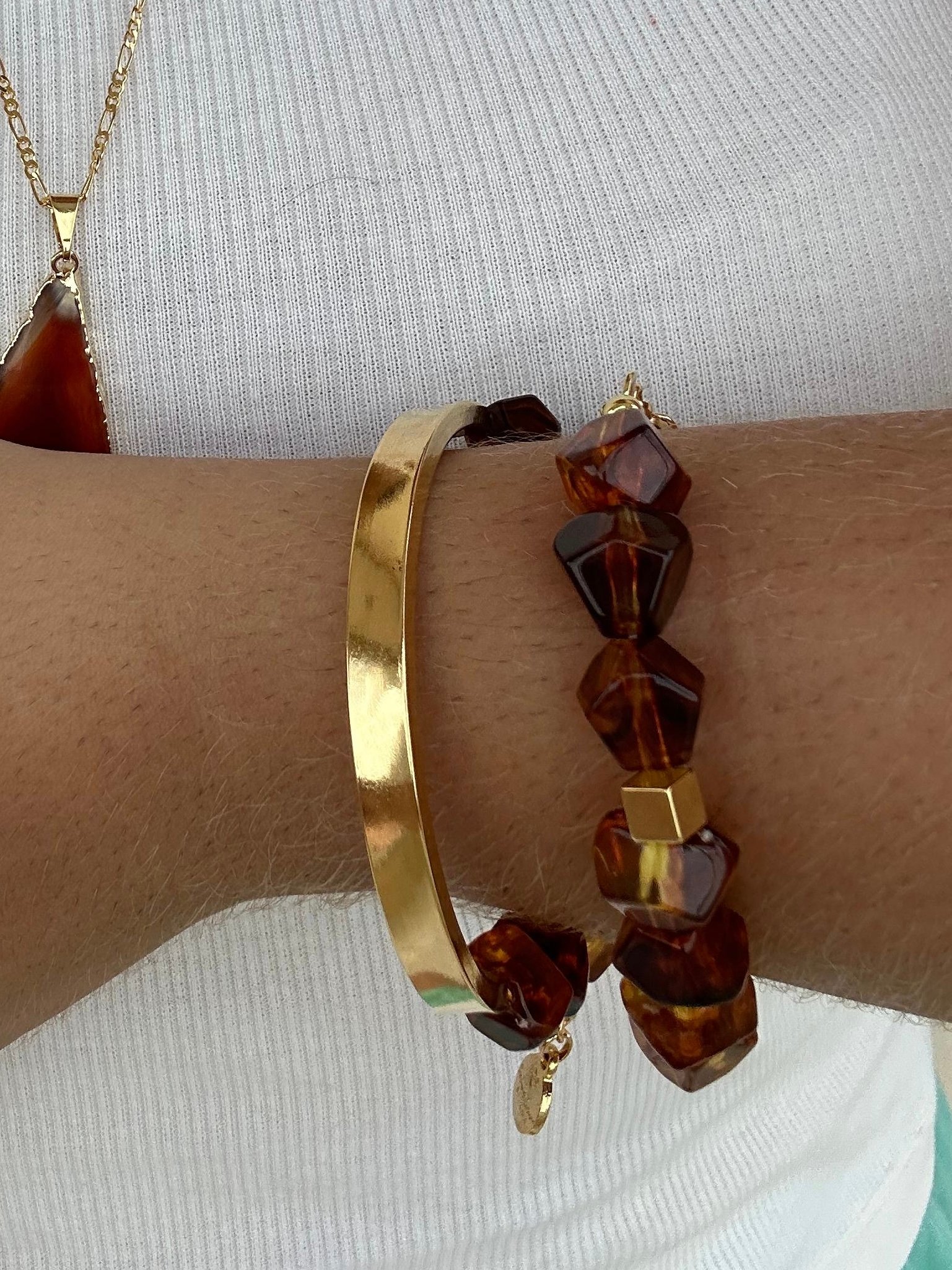Mix de pulseiras composta por duas pulseiras  em pedras de resina com espaçadores em forma de cubo e placa dourada .